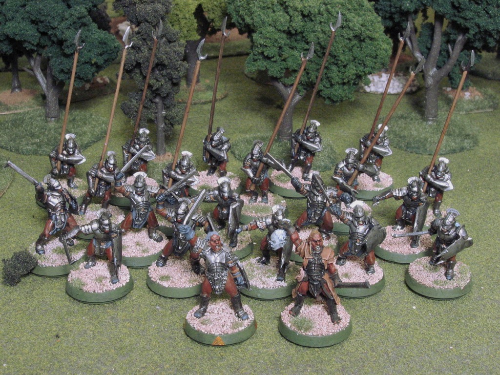 Trying to get past them are two Uruk-hai Captains with shield (one represented by Uglúk) leading ten Uruk-hai with sword and shield and ten Uruk-hai with pike. Unusually, Evil has a Might point advantage here, four points to none.
