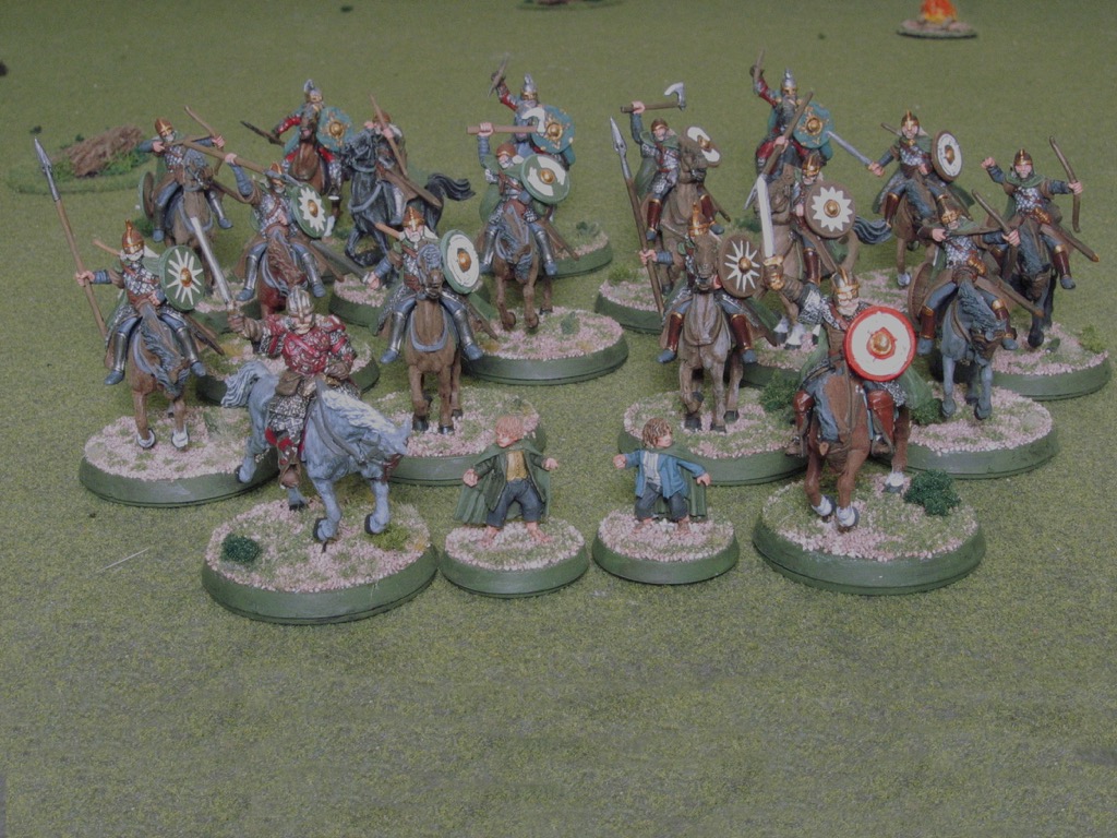 The Good force is two squads of Riders of Rohan, led by Éomer and a Captain, and three Outriders. I don't actually have any Outriders, so I've substituted Royal Guard here. Merry and Pippin are present also, of course.