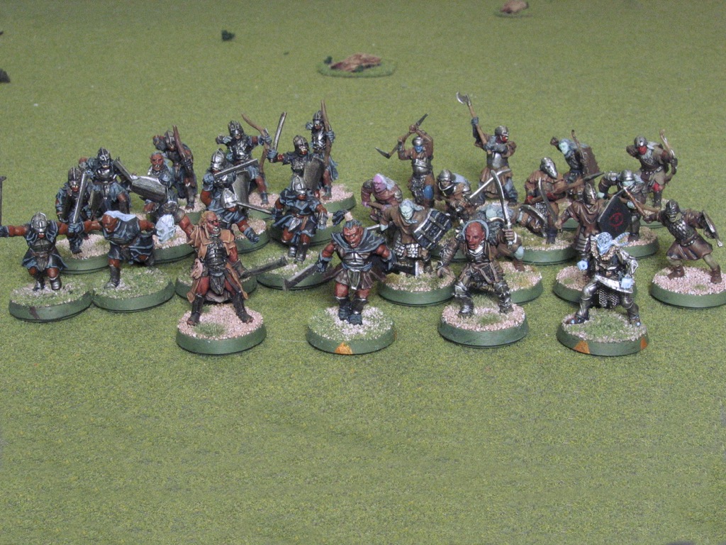 Evil has four(!) heroes: Uglúk, Mauhur, Grishnákh, and Snaga (front row). Backing them up are twelve Uruk-hai Scouts and twelve Orcs. It's nice when the orders of battle work out to exactly match the box sets.