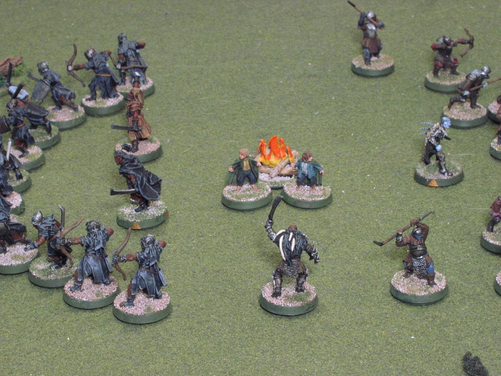 All the Good models are pinned in place, barring of course the hobbits. Pippin, somewhat unchivalrously, runs at full speed while Merry still must crawl, but fortunately he, too, breaks his bonds.