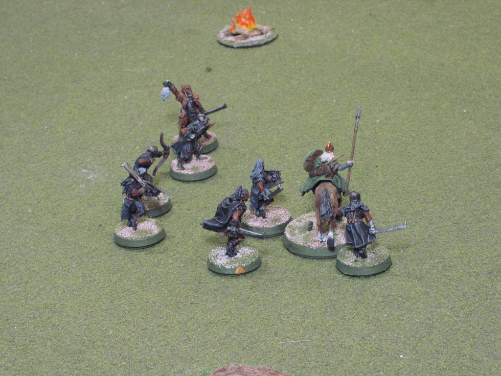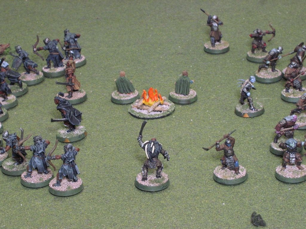 The rest of the Evil models are then deployed within 6" of the campfire. Evil deploys the Uruk-hai with Uglúk and Mauhur to the west (first picture), and Snaga and the Orcs to the east (second picture).