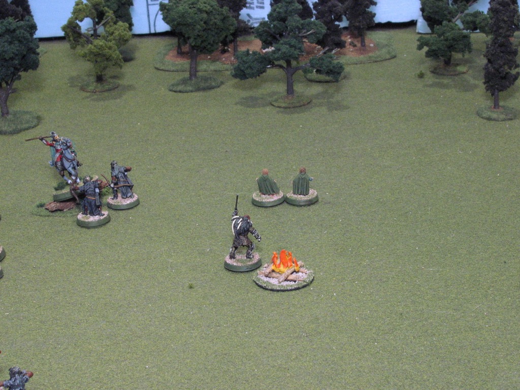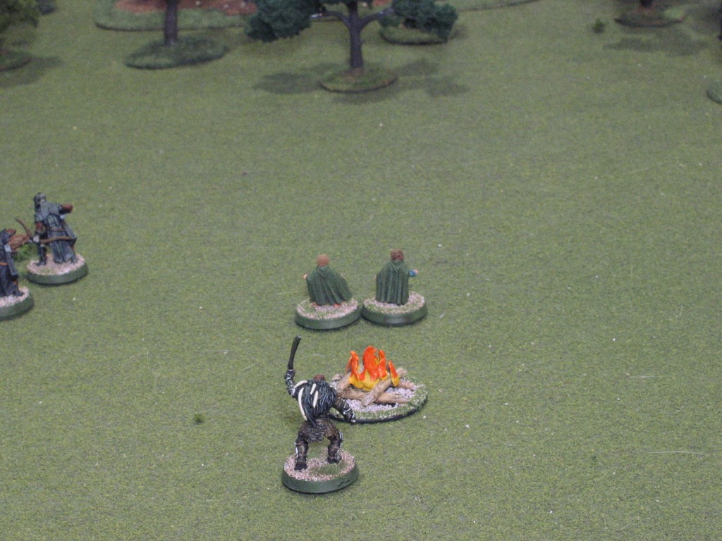 Merry and Pippin set up in the center of the board near the campfire, with Grishnákh 3" away. These three models have their own little race going on. The hobbits are ignored by everyone except Grishnákh and all three must crawl at half movement. Merry and Pippin can, on a roll of '6', break their bonds and resume normal movement.
